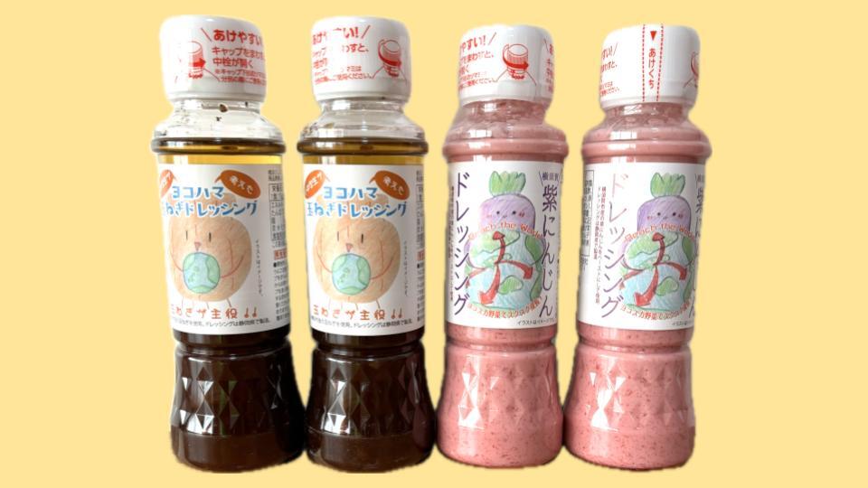 サラダだけでなく、餃子やお肉にも使えるヨコハマたまねぎドレッシングと、横須賀紫にんじんドレッシングがセットになった商品です!!